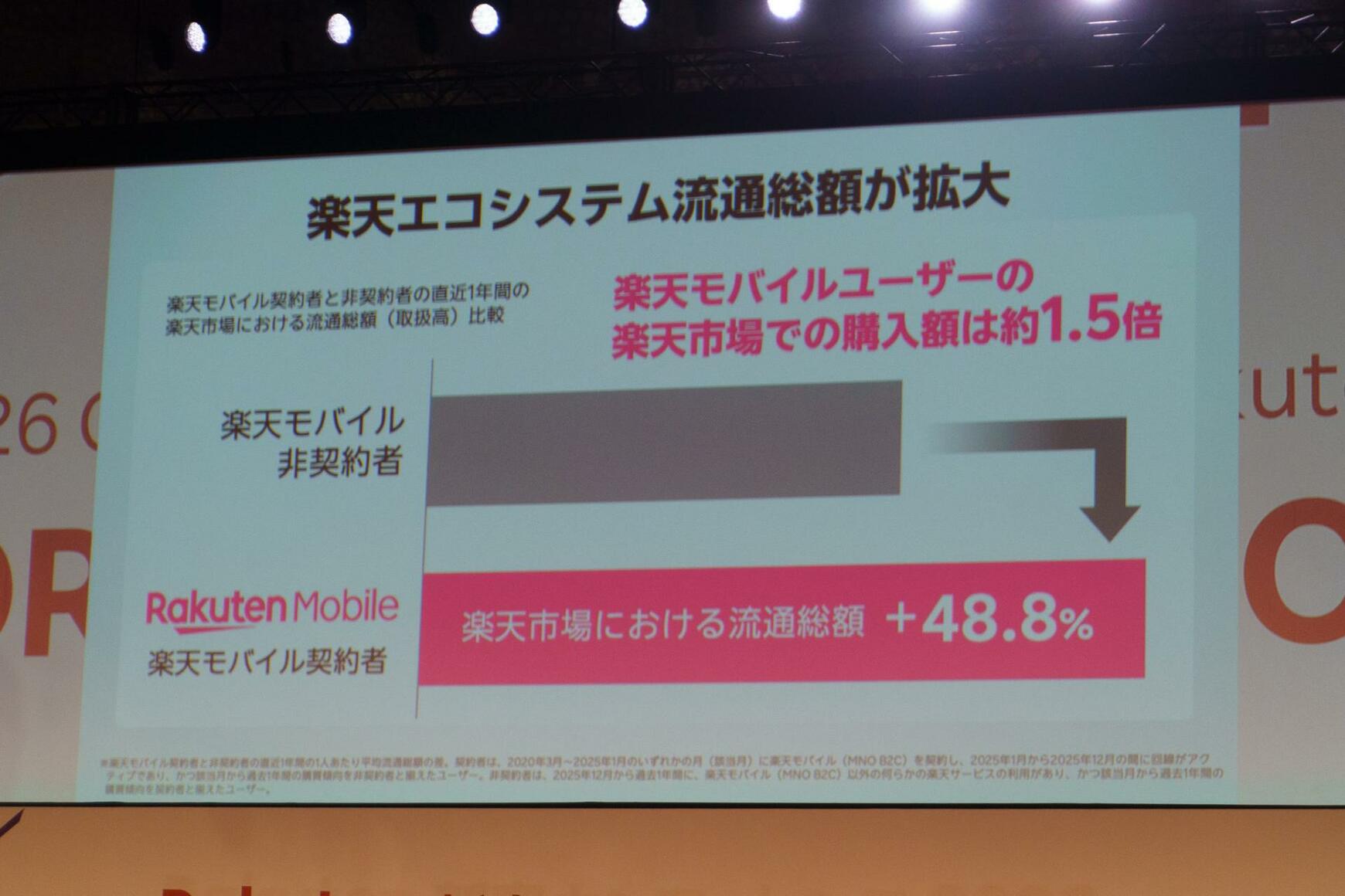 記事に戻る 楽天モバイル1000万回線は単なる節目ではない──三木谷浩史が描く「送客装置」としての通信事業と、楽天市場10兆円への設計図の写真一覧 2025年12月25日、楽天モバイルの契約回線数が1000万を突破した(筆者撮影) 1/9 下に画像が続きます 楽天モバイル契約者の楽天市場での流通総額は非契約者より48.8%高い(筆者撮影) 2/9