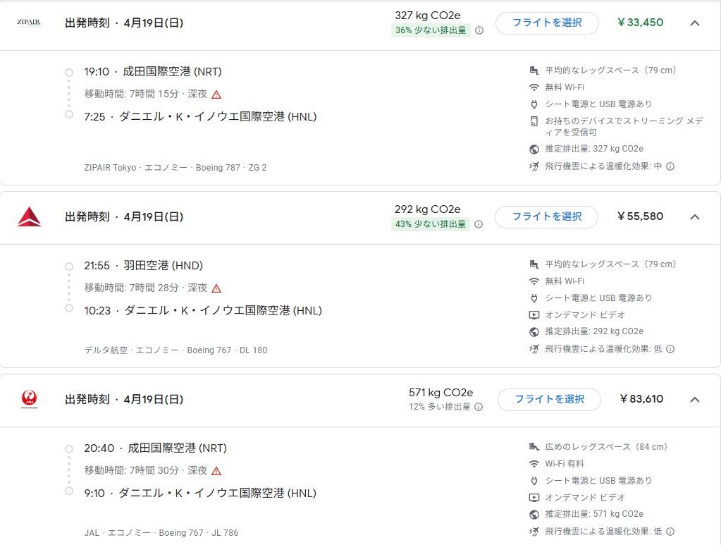 グーグルフライトの表示。各フライトの機材で電源やUSBがあるかどうか確認できる(画像:グーグルフライト)