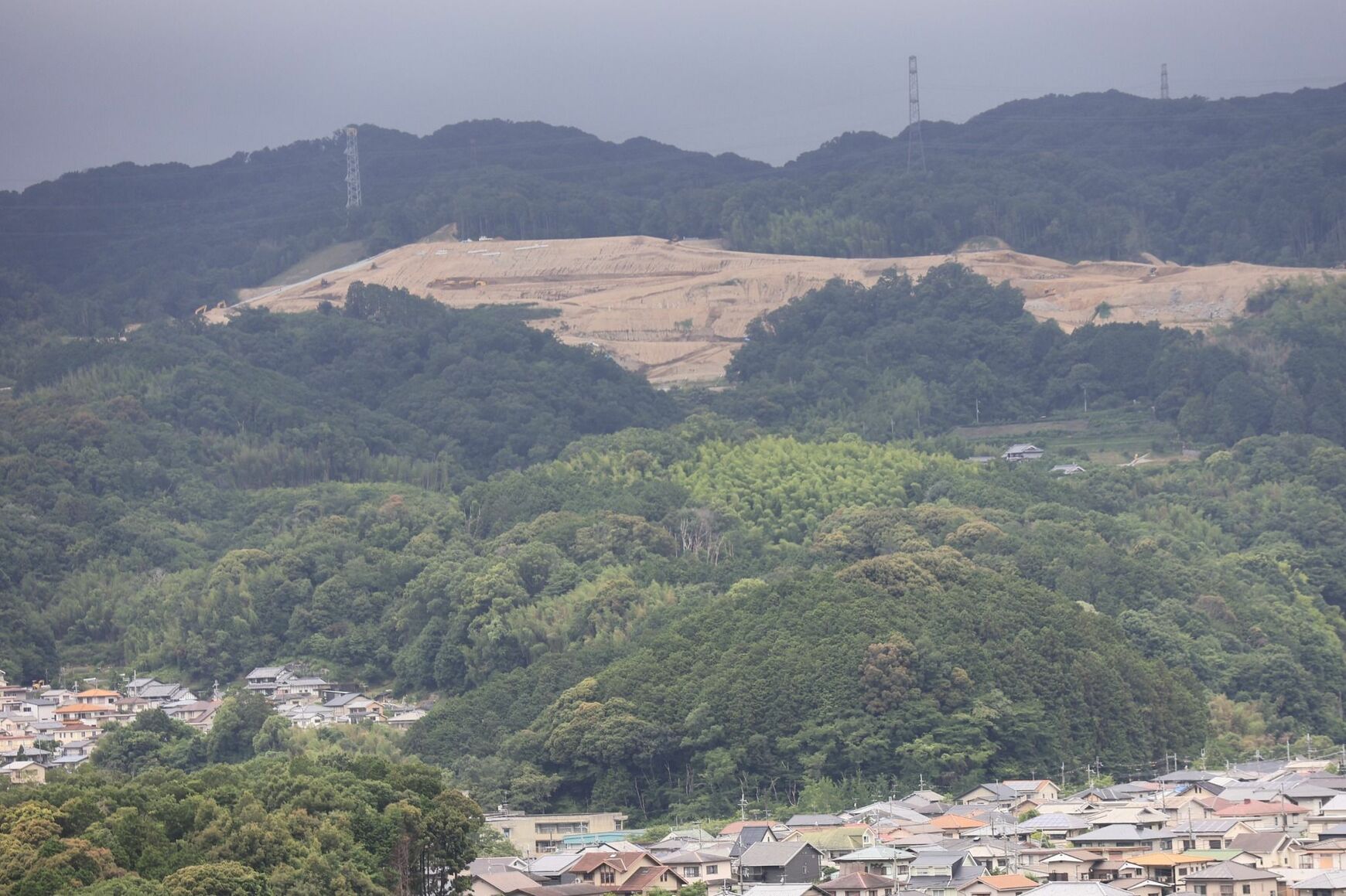 建設現場を含む平群の山。左下の端にある椿台の住民が原告となって林地開発許可の取り消しを求めている(撮影:河野博子)