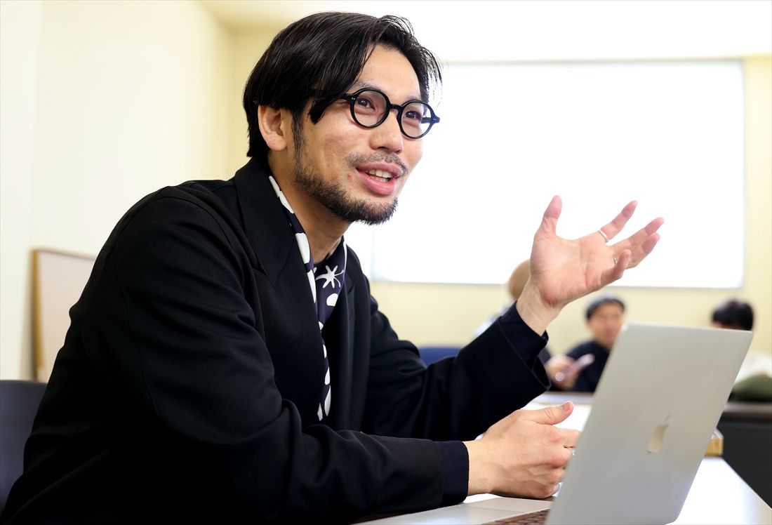 ラッピング電車のクリエイティブディレクターを務めたヘラルボニーの桑山知之氏(撮影:尾形文繁)