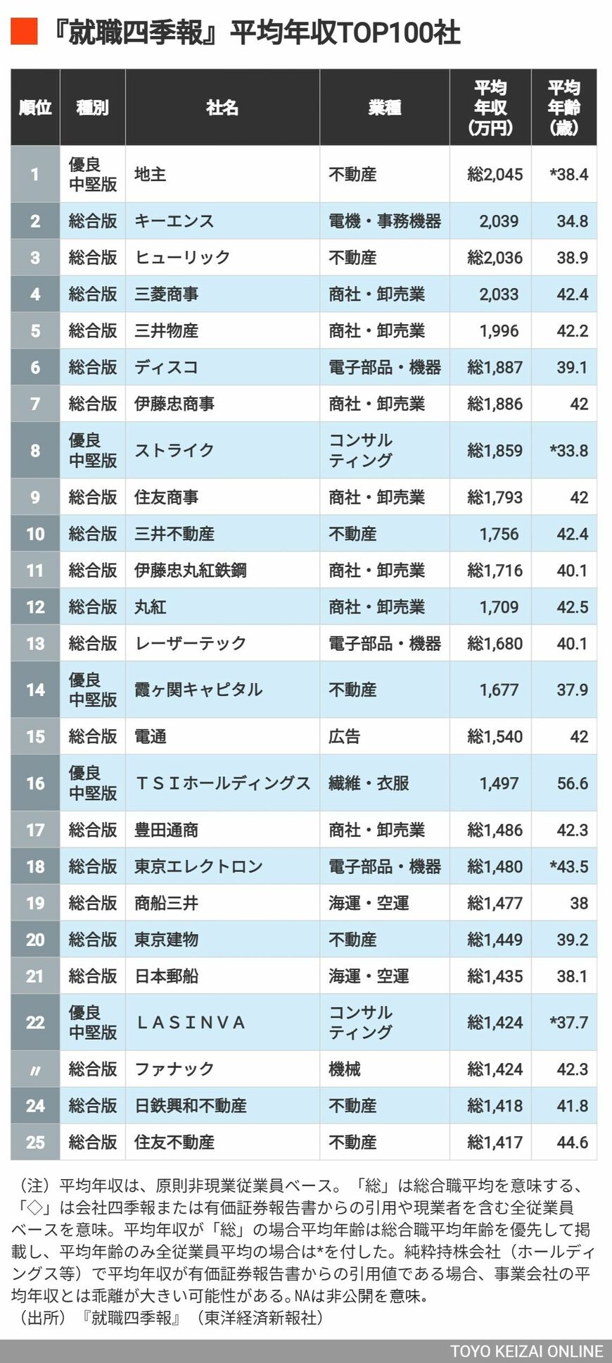 記事に戻る 中堅企業含む「平均年収"高い"」TOP100ランキング 全社平均年収1000万円超え!"隠れ高年収企業"も…《27卒向け最新》の写真一覧 平均年収総合トップは『優良・中堅企業版』のあの会社(写真:Luce / PIXTA) 1/5 下に画像が続きます 2/5