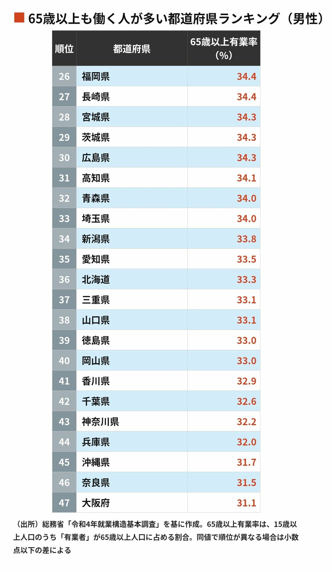 65歳以上の働く人の多さは、都道府県によってどれほど差があるのか。総務省「令和4年就業構造基本調査」…