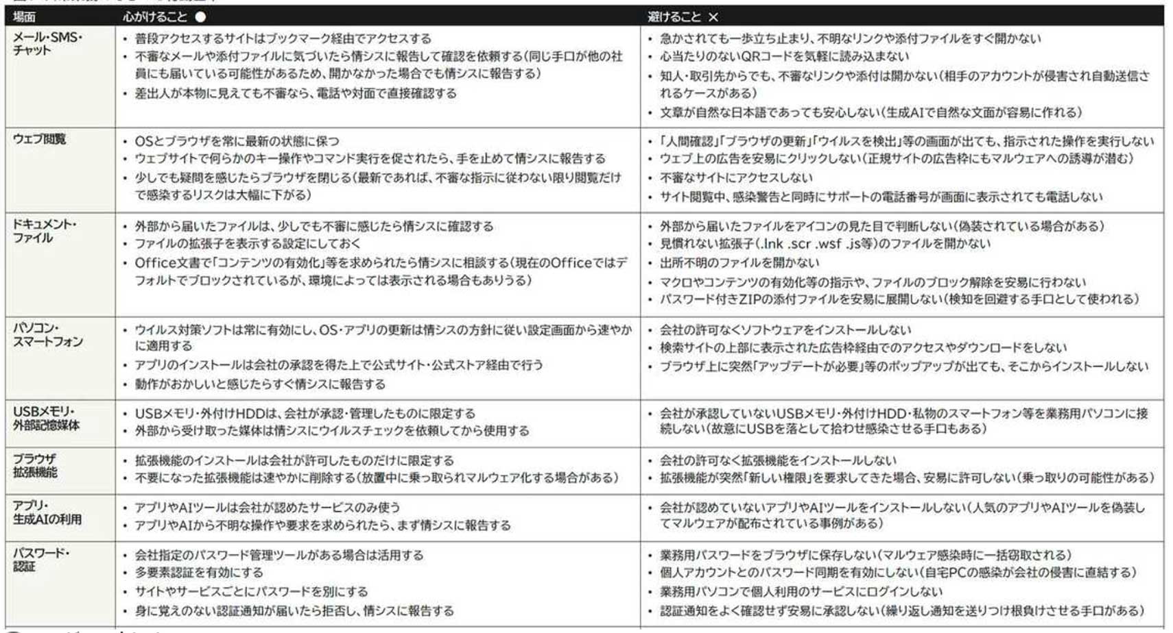 マルウェア感染に関連する観点に絞り、8つの場面ごとに心がけることと避けることを整理した。NIST・CISA・CIS・IPAなどの最新ガイドラインも参考に、実務上の観点も加え、イメージしやすいようできるだけ具体的に明記した。パスワード・認証については、マ…