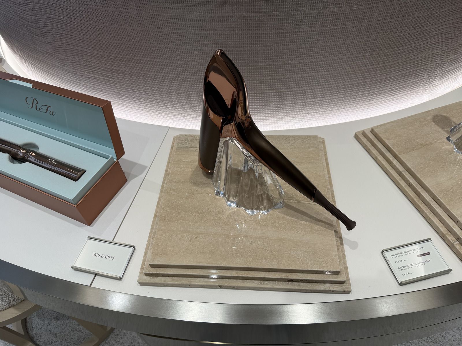 新ブランド「ReFa MONTECATINI」から発売された、銀座店限定のヘアドライヤー。12万1000円と高額ですが、入荷後即完売が続いており、筆者が訪れた3月上旬も在庫はありませんでした(写真:筆者撮影)