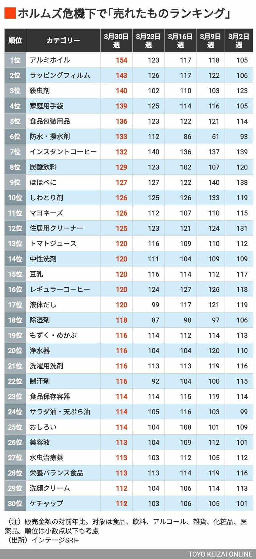 中東情勢の緊迫化が私たちの暮らしにどんな影響をもたらしているのでしょうか。全国のスーパー、コンビニ、ドラッグストアなど約6000店舗の販売データをもとにランキングを作成しました(このリード文はAIが作成しました)