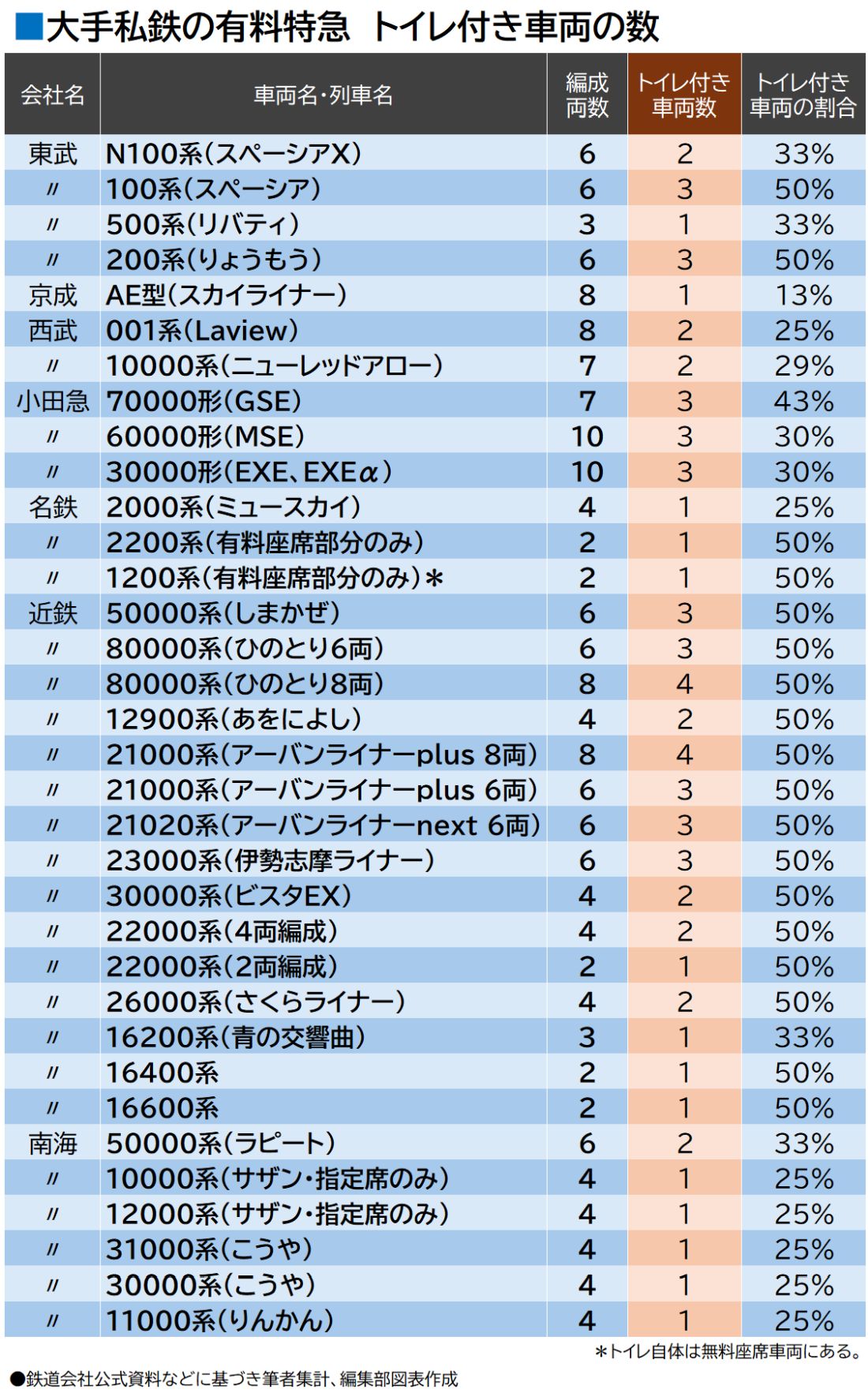 記事に戻る 新幹線・特急・私鉄、調べてわかった「トイレの充実度」 多数派は「2両に1両」だが8両編成に1両だけの例もの写真一覧 下に画像が続きます 大手私鉄有料特急のトイレ付き車両数(編集部作成) 3/26