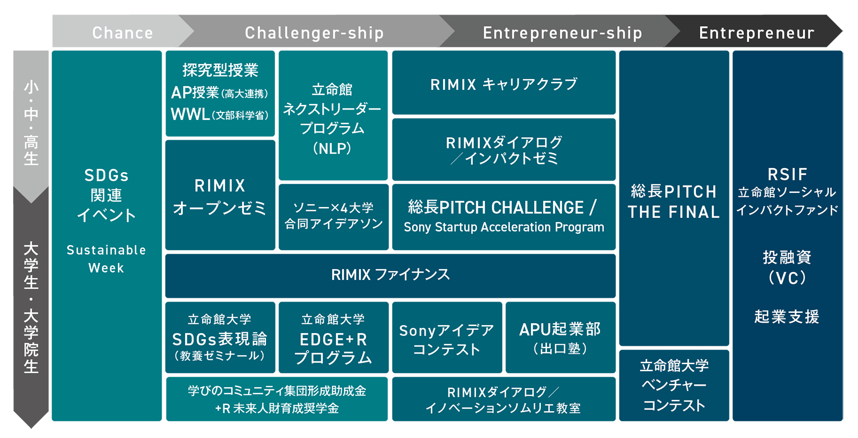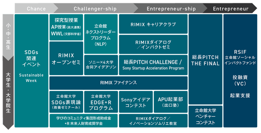 RIMIXの大きな特徴は3つある。まず1つ目が、大学だけでなく学園全体で社会起業家の育成を目指していることだ。学園内にはもともとSDGsや起業などに関するさまざまなプログラムがあるが、それらをプラットフォームとして「見える化」し、小学校から大学院まで約5万人の児童・生徒・学生に挑戦の機会を提供している。これにより、彼らの社会課題に対する問題意識を深め、起業までをシームレスに支援していく。