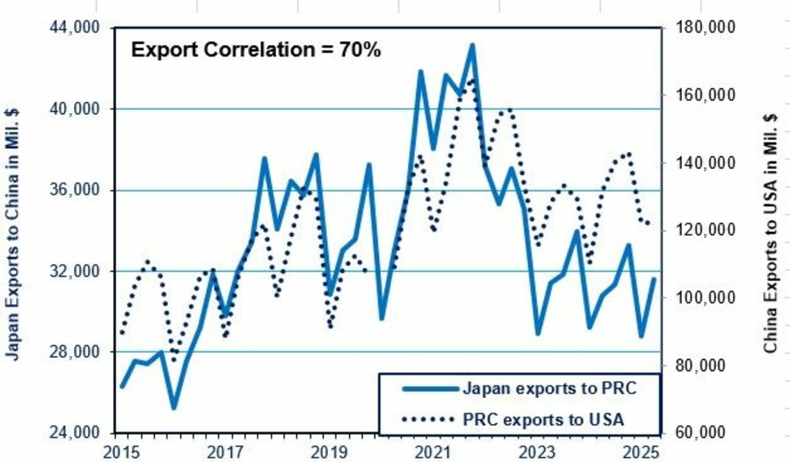 Similarly, Japan’s exports to Korea depend very much on Korea’s exports to China, which in turn depend on China’s exports to the US. Japan’s exports to Taiwan also hinge on China’s exports to the US.