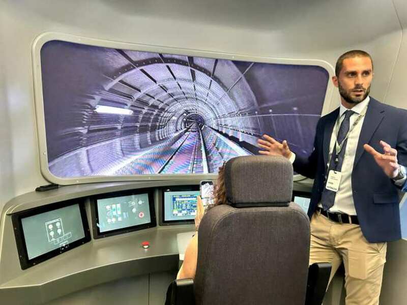 The center features a railway driving simulator and demonstrations of HMAX, Hitachi's maintenance and management solution for rolling stock and infrastructure.